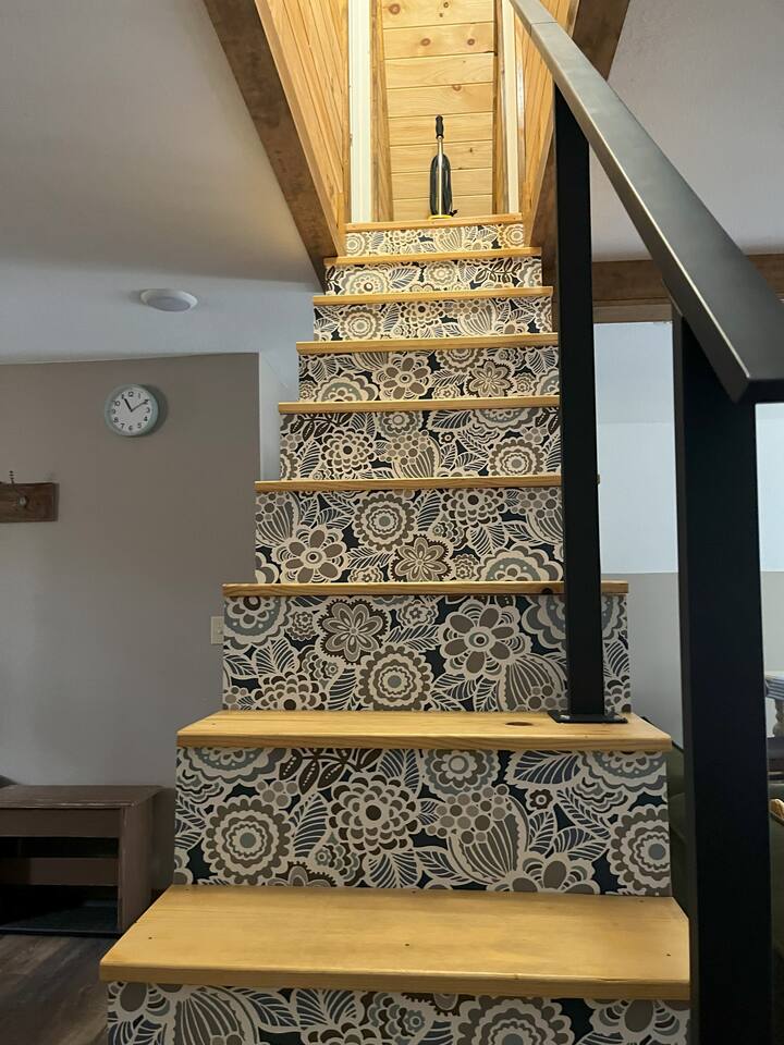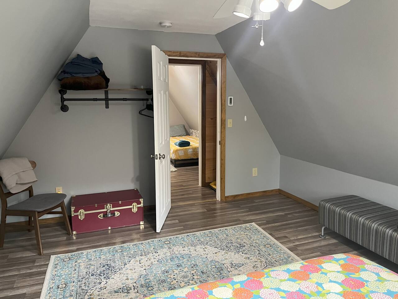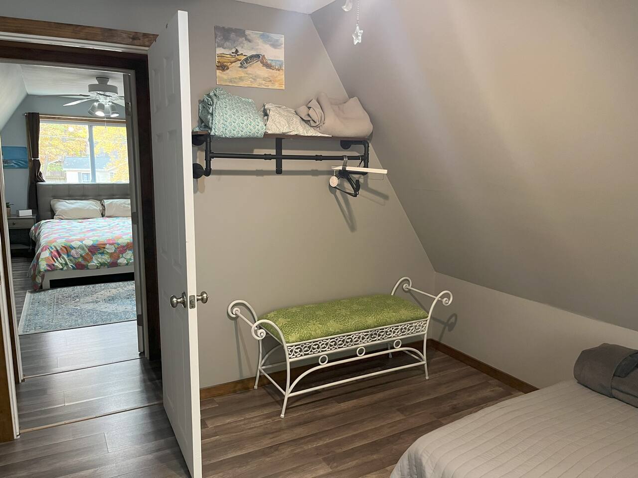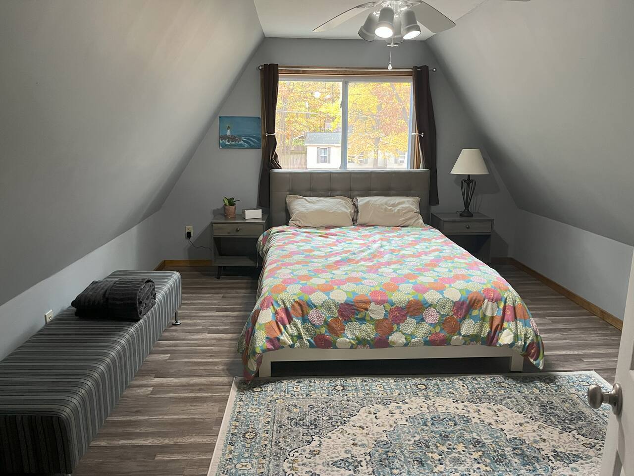 Bedrooms are up a relatively steep and narrow staircase with a secure handrail. Bathroom is downstairs. Portable A/C units on both floors. Ceiling fans in each bedroom.