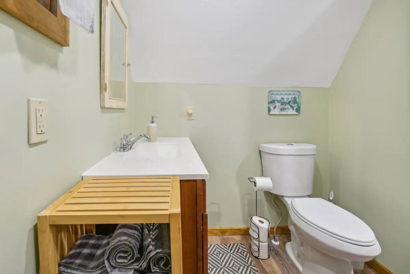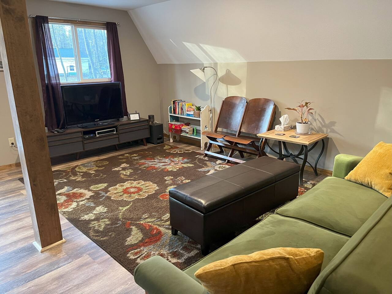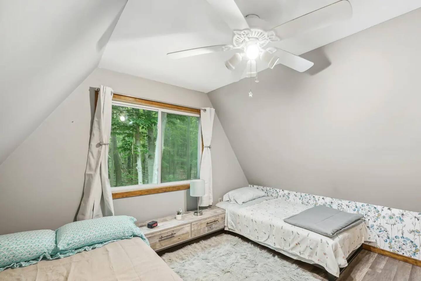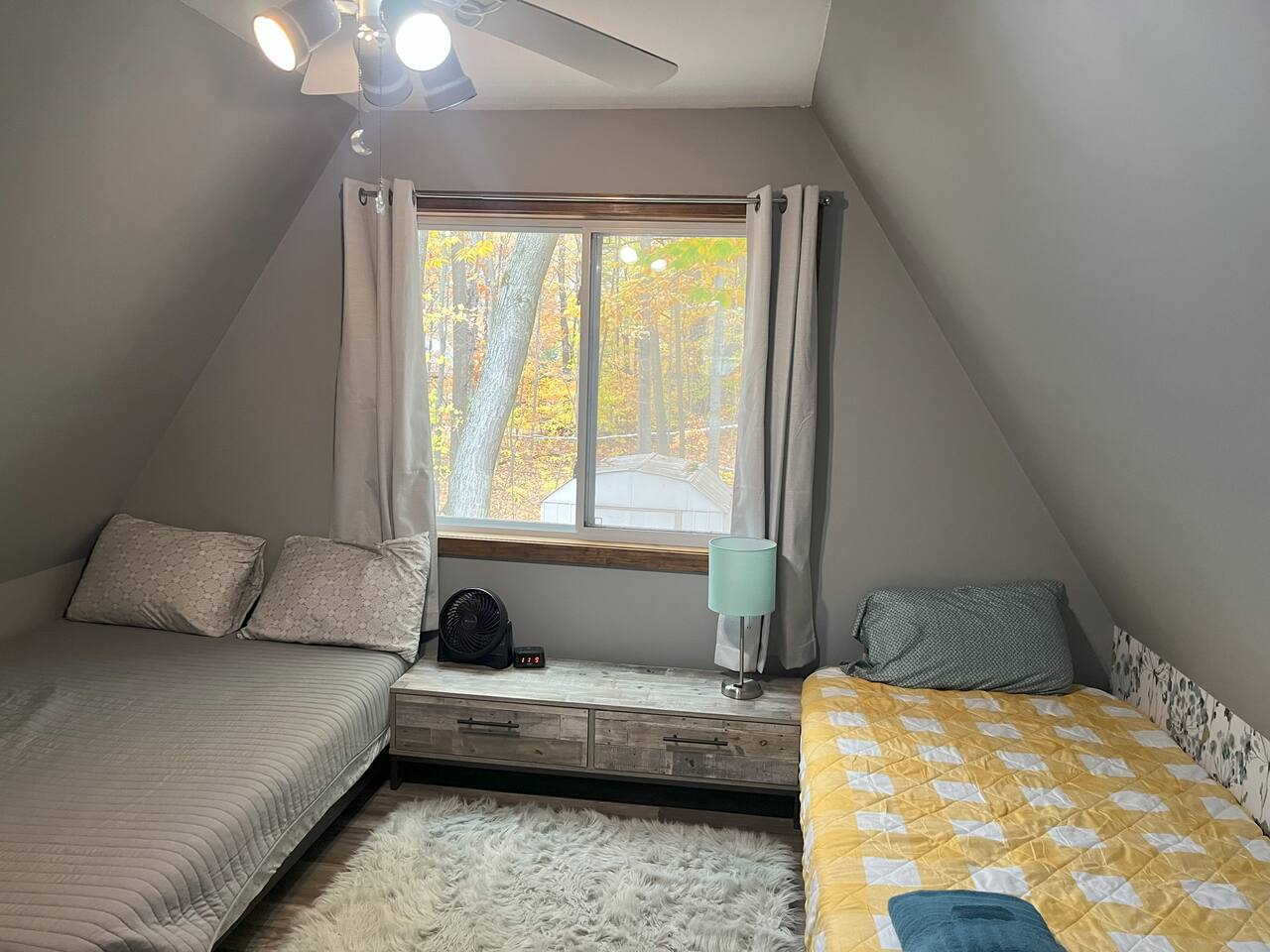 Bedrooms are up a relatively steep and narrow staircase with a secure handrail. Bathroom is downstairs. Portable A/C units on both floors. Ceiling fans in each bedroom.