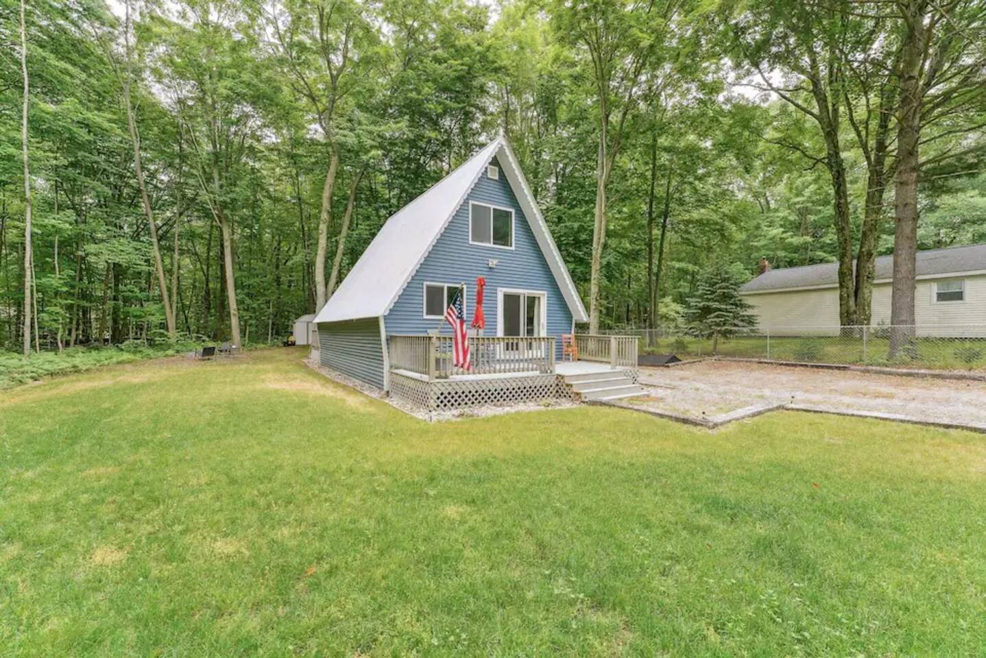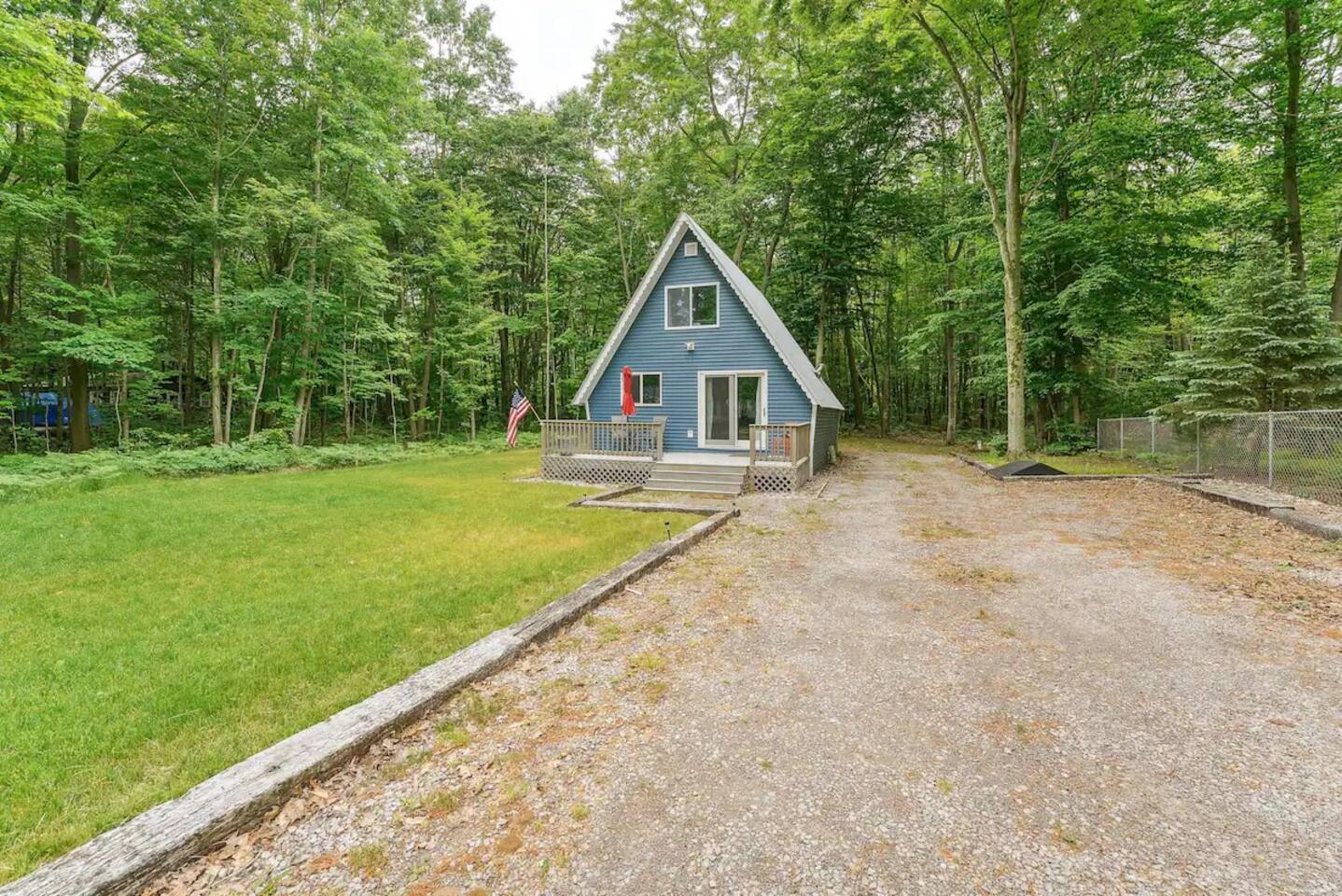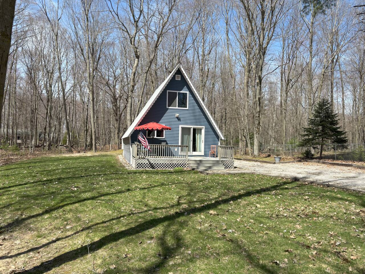 Situated near Hamlin Lake lies this pet friendly 2-bedroom, 1-bath Cozy A-Frame. With its inviting interior, furnished deck, and spacious yard with a fire pit, this clean cabin is the perfect place to unwind and connect with nature. Spend your days boating on Hamlin Lake, visiting the picturesque Ludington State Park, exploring Ludington’s shops and restaurants, or beach-combing along Lake Michigan. These are just a few adventures that await! Large driveway has ample parking for RV/Boats.