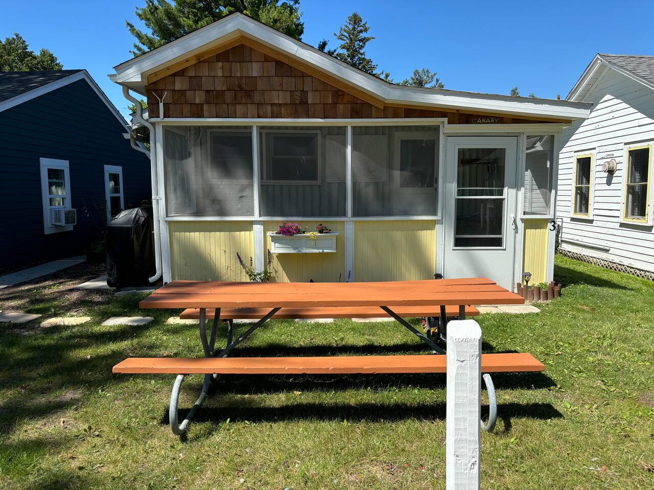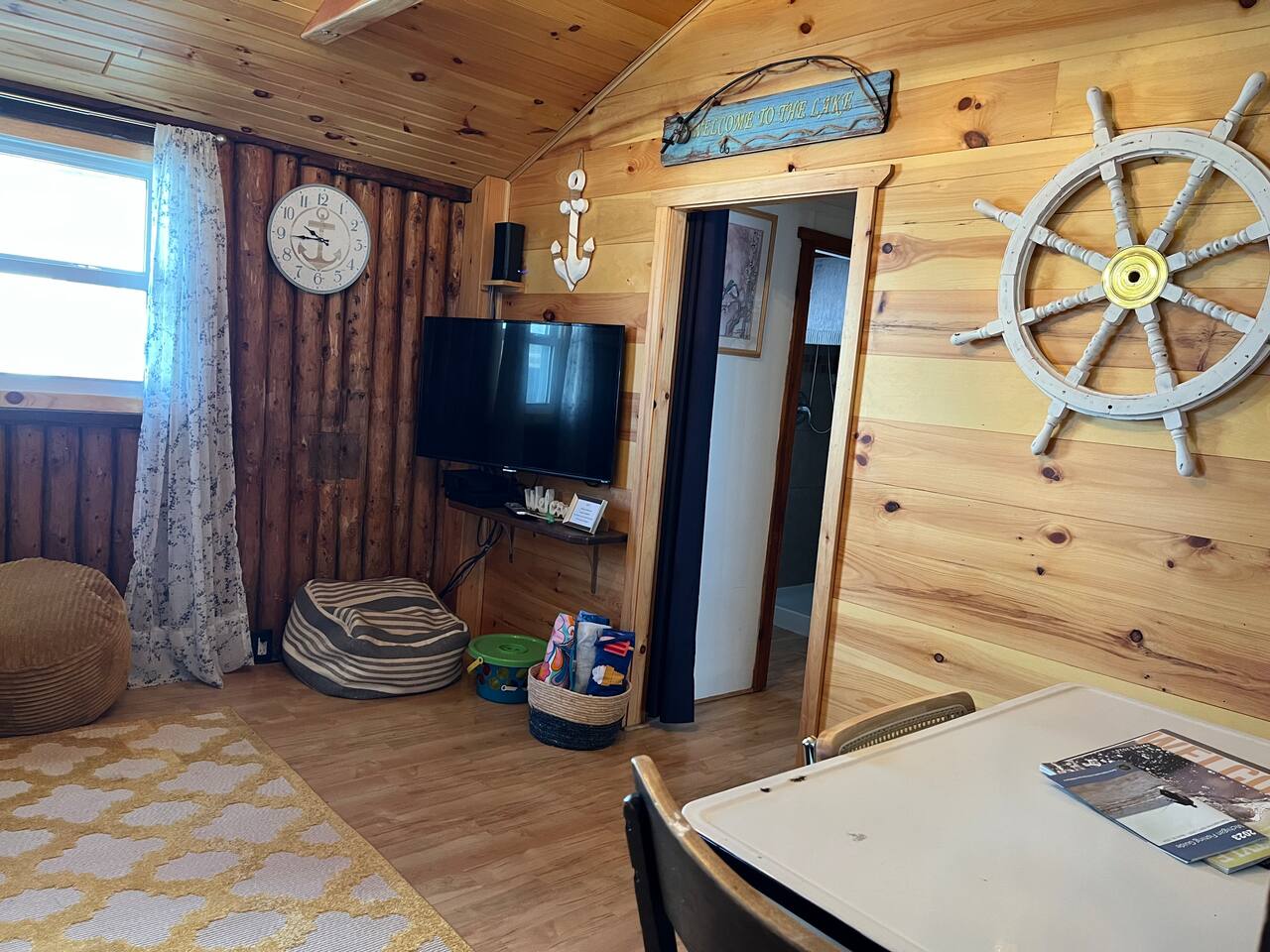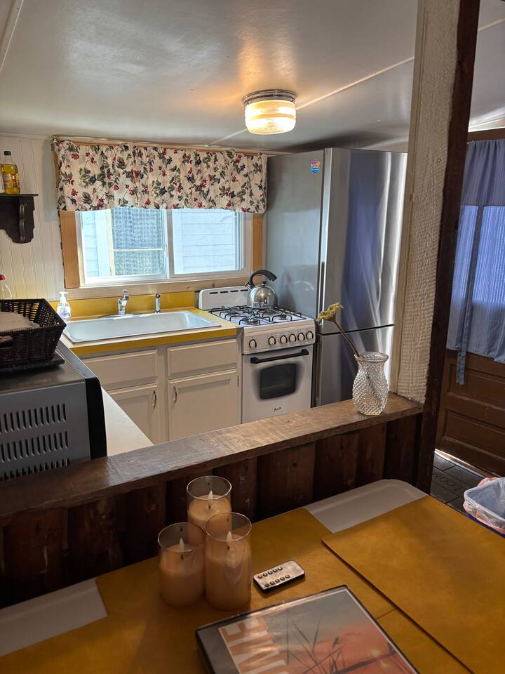 Why you will love staying here (from past reviews): *Location and Views: The cottage is right on Hamlin Lake, and guests love that they are only steps away from a beautiful lake view. The sunsets from the dock are a frequent highlight. It's a short drive to downtown Ludington and the Ludington State Park. *Atmosphere: Reviewers describe it as "absolutely spotless and so charming," a cozy little cabin with a retro, kitschy, and vintage atmosphere. *Family-Friendly: It's considered perfect for a small family or a couple's getaway. Families loved the shared amenities on "Vacation Lane," including the small sandy beach, playground, and swimming area, with one guest stating they are "building vacation memories to last a lifetime." *Amenities: Guests appreciate that the cottage is well-stocked for cooking and comfortable living, noting the gas grill, picnic table, and kitchen basics. Canary Cottage is part of a duplex with sister 1 bedroom 1 bath cottage Sandpiper (rented separately w/separate entrance) and located at Vacation Lane. Family friendly Vacation Lane is 13 privately owned cottages with common spaces including a small sandy beach, swimming area, marina, playground, fire pit, horseshoes, charcoal grill, beach chairs, small chapel and a game room for rainy days. Canary is a small cozy space approx. 400 SQFT. Includes all linens and bathroom/kitchen basics. Boat slip may be available (18ft max, shallow draft) and must be reserved. The public boat launch is directly across the street, no launch facilities (other than kayaks) at Vacation Lane. Walking distance to Ice-cream/Ice/Bait shop, boat rentals. Short drive to Ludington State Park and Ludington. Cottage details: Bedroom 1: Queen Bed | Bedroom 2: Full/Twin bunk beds Outdoor Living: Screened porch, gas grill, outdoor seating & dining/picnic table. Indoor Living: Smart TV, dining table, shower, heat/air conditioning. Kitchen: Stove/oven, refrigerator, cooking basics, dishware/flatware, coffee maker, toaster, microwave. General: Free WiFi, central heating/air conditioning, complimentary toiletries, hair dryer, hangers, linens/towels, trash bags/paper towels. STRICT NO PET POLICY. Parking: Off Wisconsin and Indiana Streets. Room for boat trailers off Indiana Street only. Do not bring boat trailers down Vacation Lane. Lake Access: Private beach with swimming area. Kayaks can be launched from the property (not included). Boat slip may be available **must be reserved. Max boat length 18ft, shallow draft. Public boat launch, South Bayou Park, is directly across the street from Vacation Lane. Lakeside: Enjoy lake breezes and sunsets on Hamlin Lake! Fish from the docks. Ludington: Home to 28 miles of sugar-sand coastline and four different beaches. Outdoor rec includes boating, fishing, hiking, lighthouses, farmers market, shops, restaurants, live music, etc. Check the event calendar at pureludington!